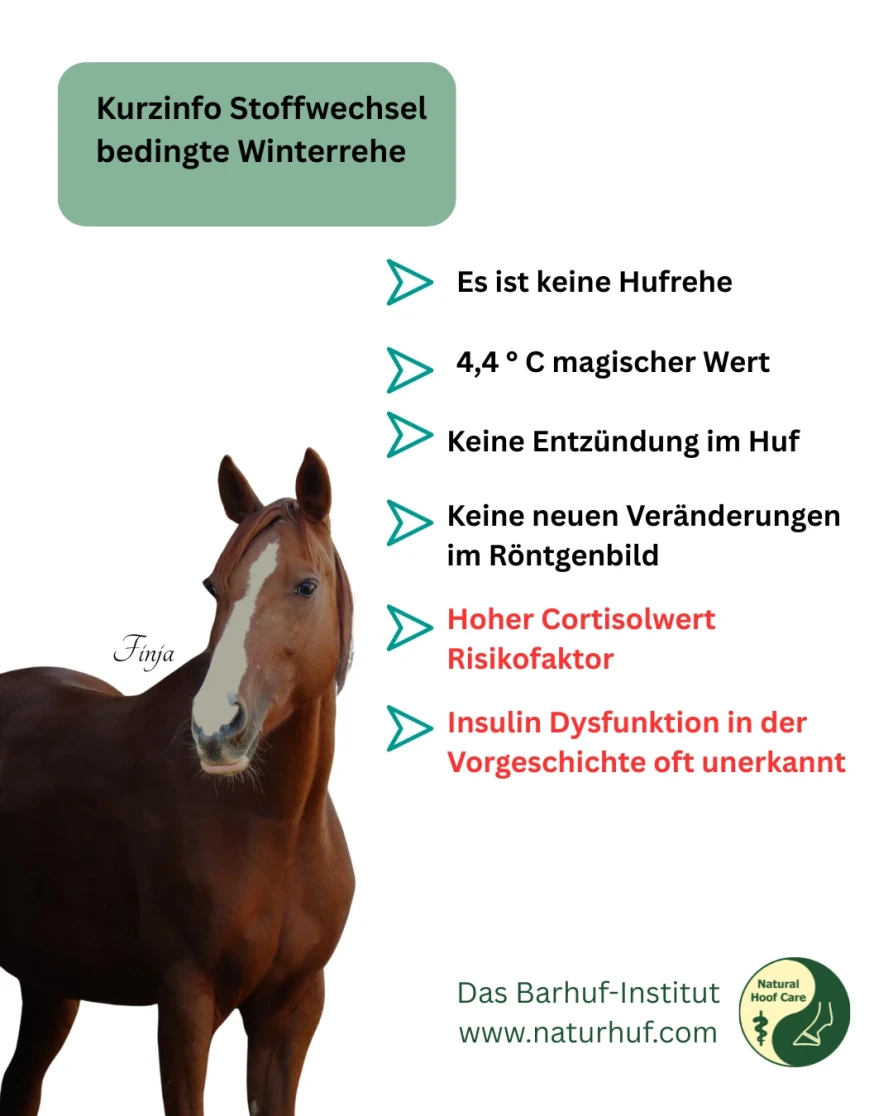 Eine Vorgeschichte von Hufrehe und/oder zumindest vermuteter Insulin Resistenz findet sich laut Dr. Kellon bei allen Pferden mit Winterrehe. Hohe Cortisolwerte bei Pferden mit Insulin Resistenz und PPID sind Risikofaktoren für Kälte induzierte Schmerzen im Huf. Cortisol verstärkt drastisch die Reaktion im Huf auf Vasokonstriktoren. Vasokonstriktoren sind Botenstoffe, welche zur Verengung der Gefäße führen. Insulin erweitert normalerweise die Gefäße. Diese Reaktion des Körpers auf Insulin könnte bei der Insulin Resistenz allerdings blockiert sein.