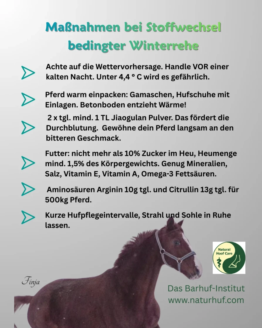 Eigentlich ist der Begriff „Winterrehe“ nicht korrekt, wenn auch die Symptome oft ähnlich der Hufrehe sind. Passender wäre „Kälte induzierte Schmerzen im Huf“.