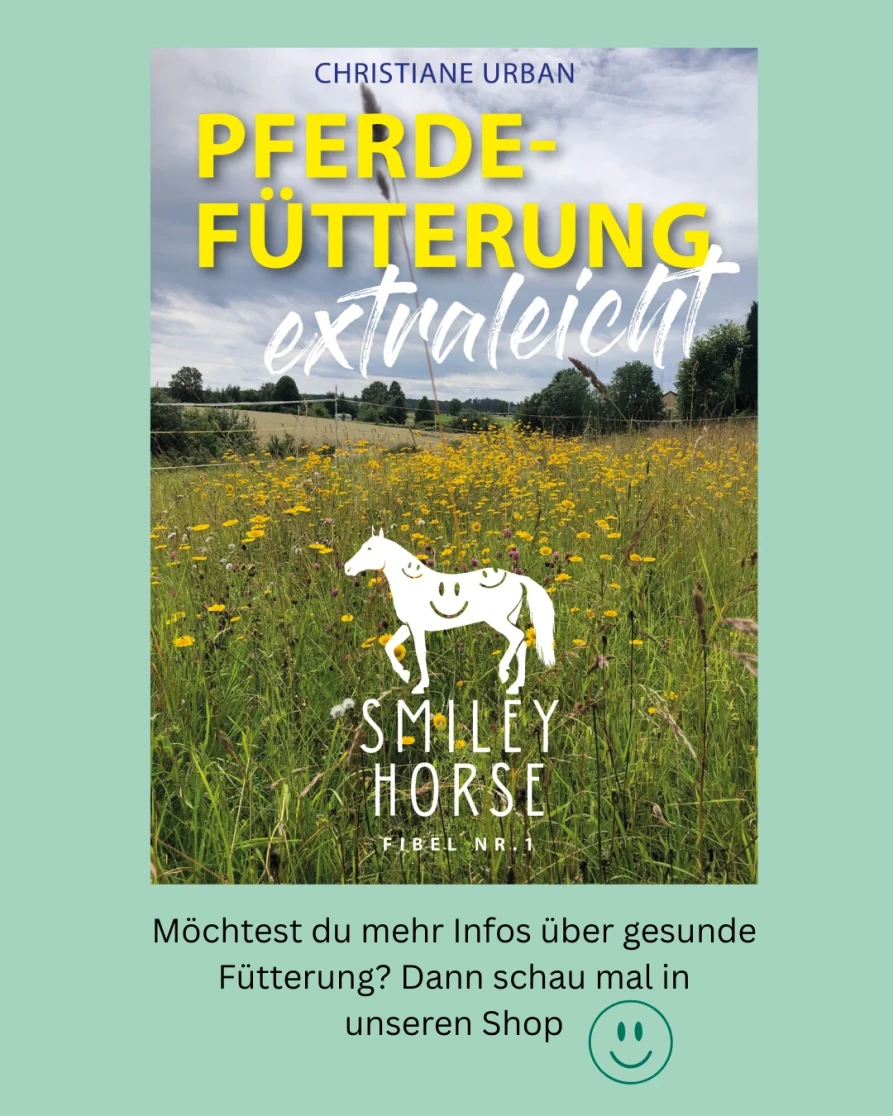 Stelle sicher, dass die Ernährung deines Pferdes arm an Zucker und Stärke ist, aber genug Heu und im Heu fehlende Mineralien und Spurenelemente beinhaltet.